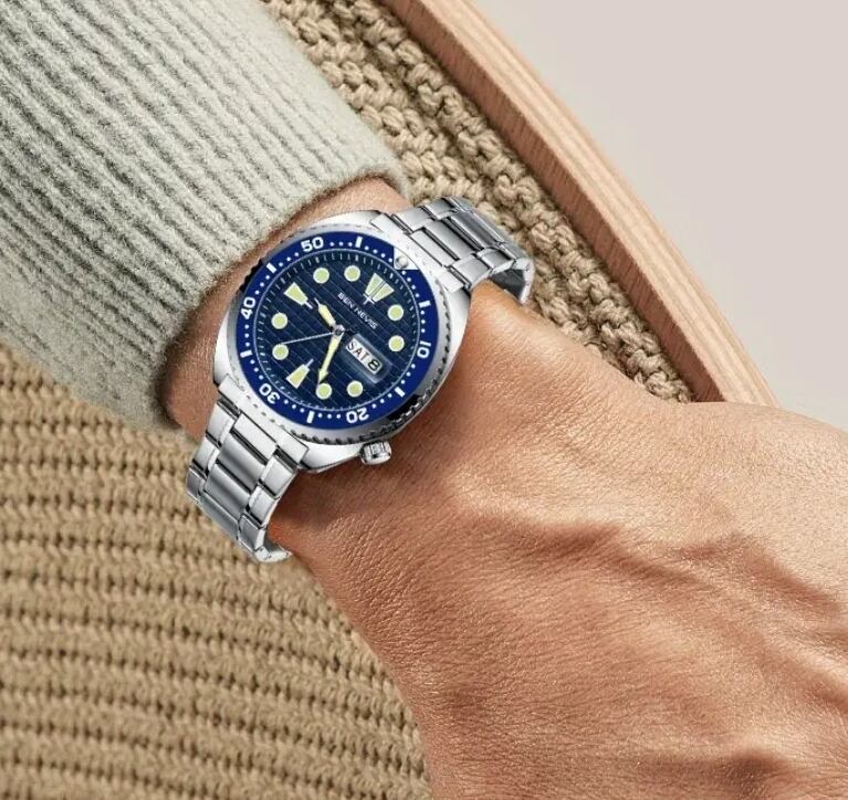 高品質なクォーツムーブメントを搭載し、正確な時間を提供します。
