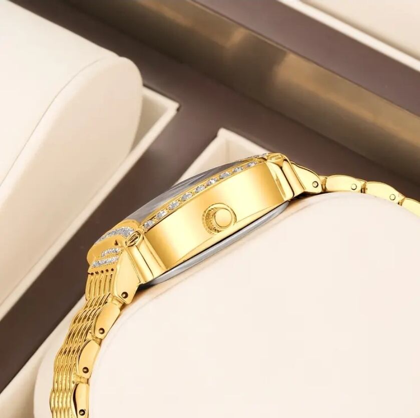 ゴールドの合金ケースとバンドには、美しいラインストーンが施されており、ビジネスシーンやフォーマルな場面でも輝きを放ちます。